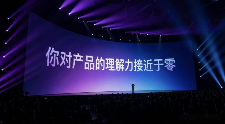 根据文字生成一张照片:一个宏大的苹果发布会现场,现场很多观众,场景很暗,有绚丽的灯光,镜头聚焦在很宽的大屏幕,弧形屏幕,文字和屏幕一样有一定的透视感,很小的人物剪影站在舞台上,紫色到蓝色弥散背景上,白色文字有一些渐变,像是现场实拍,高级感 16:9