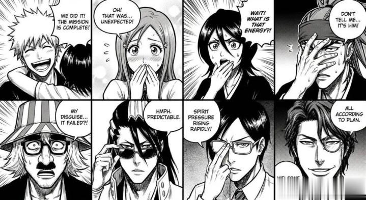 Step 2: 将这些内容绘制成 8 格的《死神》风格漫画。在漫画中加入对话气泡,并创作一个引人入胜、充满动作的故事情节。输出:一页风格化的漫画