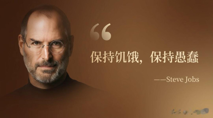 一张宽的名人金句卡,棕色背景,衬线体浅金色 “保持饥饿, 保持愚蠢” 小字“——Steve Jobs”。