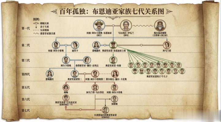 画出《百年孤独》中的重要人物关系图,用中文表示关系